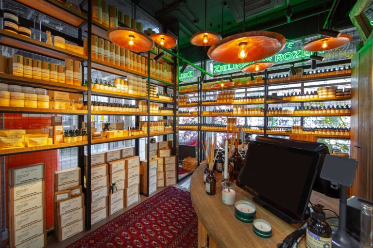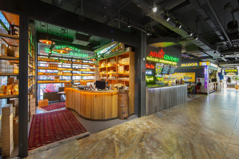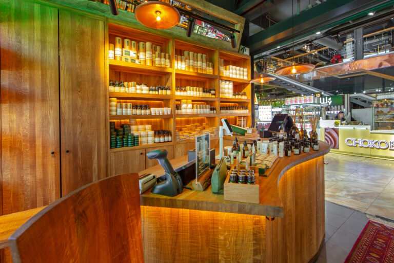 - Полностью изготовлено всё торговое оборудование (используемый материал: массив дуба, сталь, зеркало, светодиодная подсветка).
